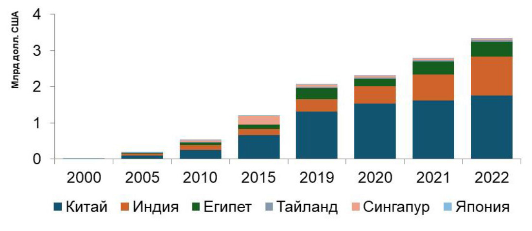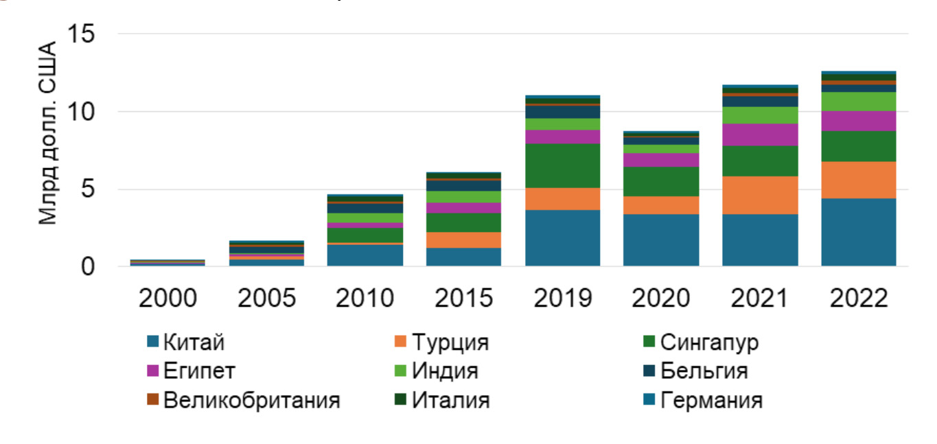 География экспорта продуктов нефтехимии из Саудовской Аравии достаточно диверсифицирована, основные экспортные рынки представлены азиатскими импортерами (рис. 4). В первую очередь это Китай, а также Турция, Сингапур, Египет и Индия.
