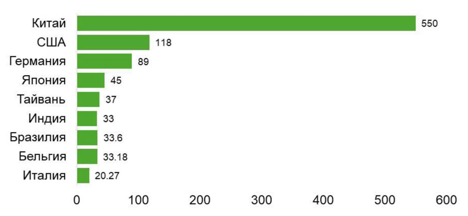 Если рассматривать нефтехимию в мире в целом, то в период 2016–2023 гг. производственные мощности отрасли увеличились с 1.8 млрд т до приблизительно 2.6 млрд т. Динамичное развитие производства поддерживается растущим глобальным спросом на нефтехимическую продукцию, что с одной стороны выступает фактором, а с другой стороны результатом высоких темпов экономического роста. Повсюду в мире крупные нефтехимические компании инвестируют ресурсы в строительство новых производственных мощностей, лидером в этом отношении является Китай (рис. 2).
