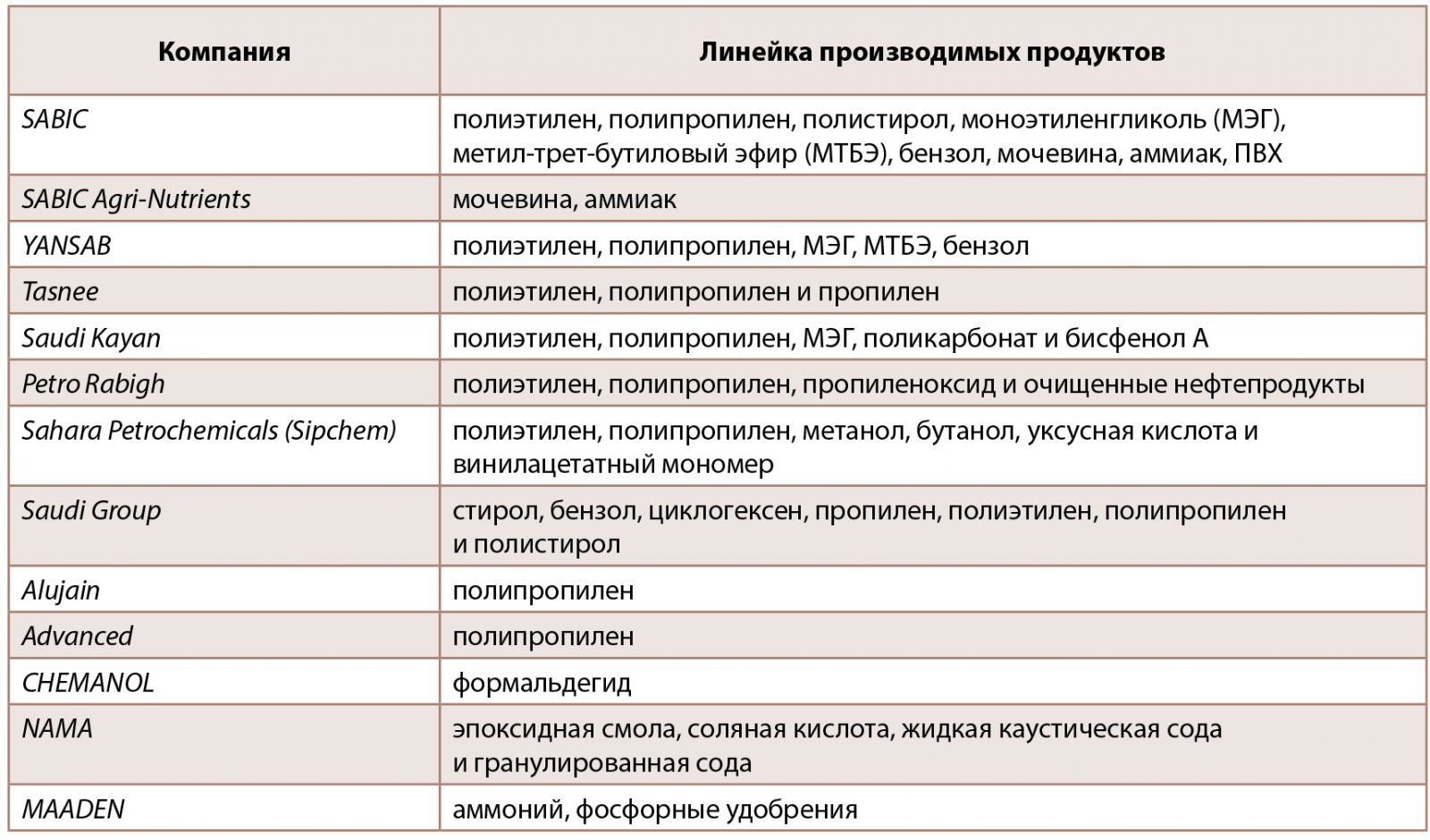 Несмотря на трудности, глобальные конкурентные позиции SABIC остаются прочными. Компания занимает верхние строчки в списке ведущих мировых нефтехимических концернов, наряду с такими гигантами, как германская BASF, американская Dow Inc. и китайская SINOPEC. Наряду с SABIC в Саудовской Аравии функционируют и другие достаточно крупные по мировым и тем более региональным меркам компании, обеспечивающие локализацию производства и выпуск специализированной продукции нефтехимии (табл. 1). Как и SABIC, все эти компании ориентируются преимущественно на экспортный спрос.