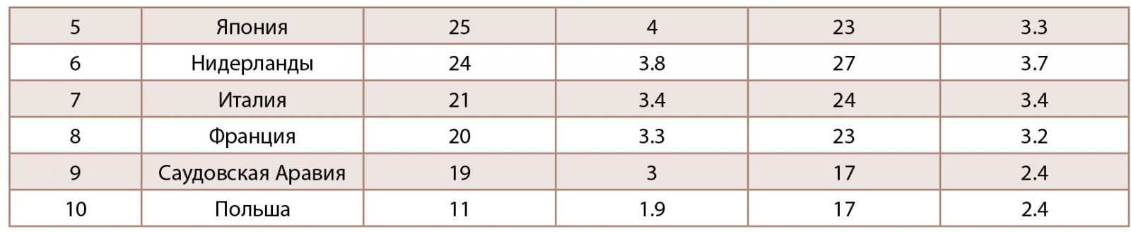 В рамках развития нефтехимического комплекса Саудовская Аравия, кроме производства этилена, сконцентрировалась также на выпуске продукции категории “пластмассы и изделия из них”, включая полиэтилен, полипропилен и другие сложные полимеры, широко используемые, например, в автомобильной промышленности. Спрос на эти продукты на мировом рынке достаточно высок. Саудовская Аравия входит в первую десятку экспортеров данной продукции и лишь немного уступает Японии, Нидерландам, Италии и Франции (табл. 2).