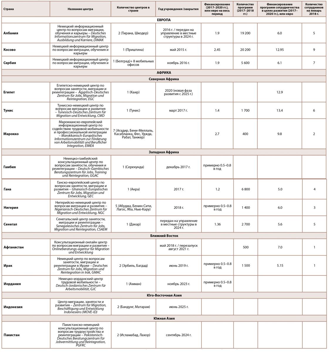 В настоящее время насчитывается 15 Центров по вопросам миграции и развития, из которых на июнь 2025 г. 12 были действующими, а их подразделений – как минимум 34. Они представлены в различных регионах мира: в Европе (за пределами Евросоюза), в Северной и Западной Африке, на Ближнем Востоке, в Южной Азии. Первый подобный центр был открыт в 2015 г. в Косово и стал “успешной моделью, образцом для экспорта” в другие страны мира. В связи с активизацией переговоров о вступлении страны в Евросоюз ЦМР в Албании закрыт с декабря 2024 г., а его услуги теперь предлагает Албанское национальное агентство по трудоустройству и квалификации. Предполагалось, что в зависимости от ситуации с безопасностью, возможно, будет также организовано физическое консультирование через уже существующие структуры в Афганистане. Однако ЦМР в Афганистане на фоне острого вопроса безопасности так и не был открыт.