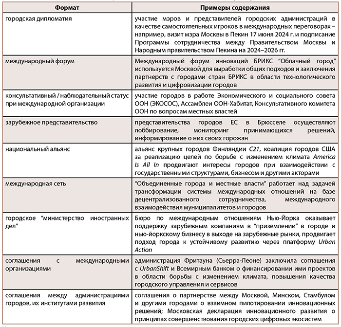 Опираясь на вышесказанное, можно выделить некоторые наиболее значимые, по мнению автора, форматы присутствия мегаполисов в мировом политическом пространстве (табл. 2).