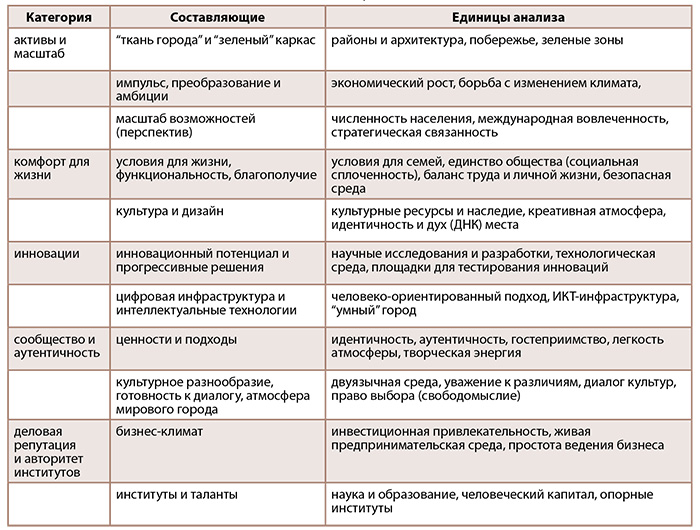 Главным управленческим инструментом здесь выступает маркетинг города – “комплекс действий городского сообщества, направленных на выявление и продвижение своих интересов для выполнения конкретных задач социально-экономического развития города. В широком смысле это продвижение интересов города… способ решения задач развития города путем расширения его влияния и создания положительной репутации” 17. Инструментарий маркетинга городов весьма обширен, однако в целом можно выделить два главных смысловых блока – материальный и нематериальный. Первый связан с продвижением зримых измерений прогресса – достижений города в транспорте, строительстве, развитии социальной инфраструктуры, общественных пространств и сервисов и др., которые становятся символами устремленности города в лучшее будущее и даже “объектами восхищения” 18. Второй блок охватывает вопросы позиционирования города на базе таких составляющих, как наука, культура, социальная атмосфера, среда для бизнеса и инноваций. Накопленный городом капитал в этих двух сферах усиливает его позиции как пространства развития, притягательного для жизни и творчества. Существует множество метрик оценки международного бренда города как репрезентации такого капитала в массовом сознании. Для настоящей работы любопытной представляется методология лондонской компании The Business of Cities: ее составляющие дают представление о том, на какие ресурсы может опираться современный мегаполис (табл. 1).