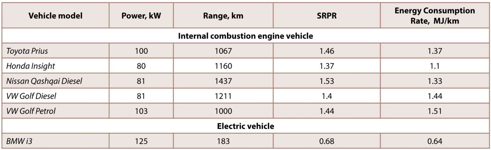 The methodology is based on the algorithm proposed by 12: vehicles are compared by the integral indicator and emissions during the life cycle. SRPR (Square Root of Power and Range), which takes into account engine power and range (critical for buyers of electric cars) 12, was chosen as the integral indicator of the technical characteristics of cars for the study: