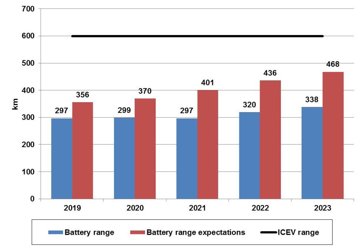 Comparison of emissions should be made for vehicles with identical technical characteristics, such as the VW Golf and eGolf 6, but there are no such analogues for most electric vehicles. Moreover, in terms of the most important parameter – the average range – electric vehicles are significantly inferior to traditional cars. According to the International Energy Agency (IEA), in 2019–2023, the average range of electric vehicles increased only from 297 km to 338 km, which is less than both the value desired by buyers and the average mileage of a car with an internal combustion engine (Fig. 2). In 4, BYD Qin is compared: an electric vehicle with a range of up to 90 km and a car with a range of up to 800 km, in 10 BYD Qin with a range of up to 90 km and Volkswagen Lavida with a range of up to 845 km. The problem of comparison by technical characteristics can be solved by using special integral indicators, such as in 12. This study shows that in Norway, the trend greenhouse gas emissions of EVs are lower than those of non-EVs, while in the UK they are similar.
