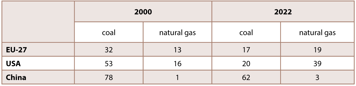 The universal driver of decarbonization of the power industry is the reduction of coal generation, but in the EU countries it is being displaced by generation from renewables, and in the USA – by gas. In China, coal continues to dominate the power industry (Table 2).
