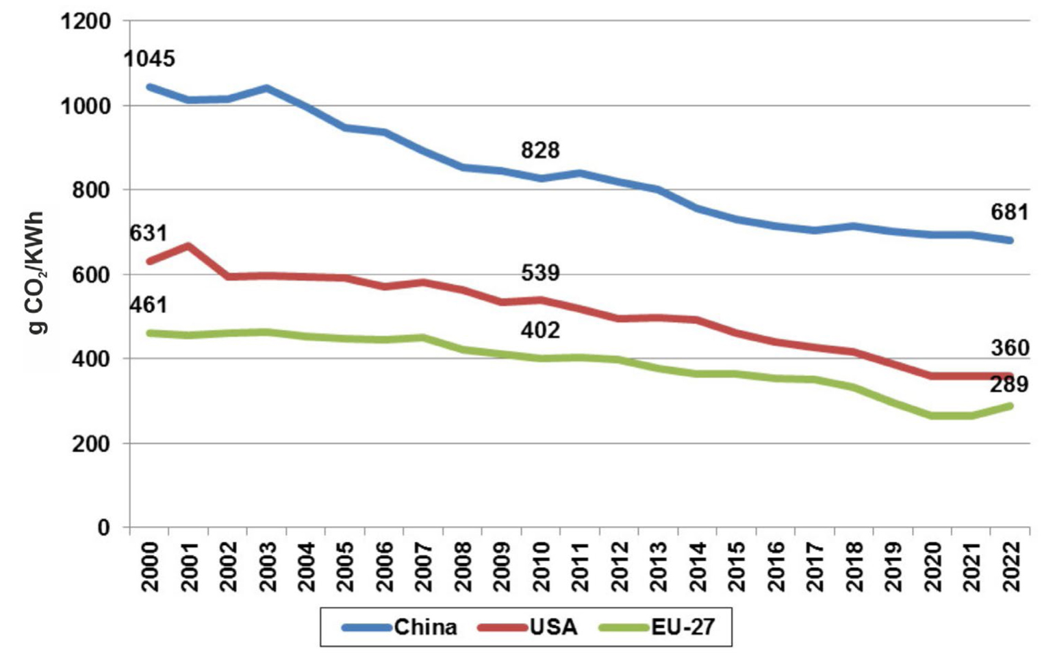 Greenhouse gas emissions from the power sector are critical for assessing the life-cycle emissions of electric vehicles. Over the past 20 years, countries leading the energy transition have been able to achieve a significant reduction in the carbon intensity of power generation (Fig. 3). The lowest emission rates are in the EU power sector, although the post-pandemic crisis, when rapid economic recovery and low output in wind and hydro generation coincided, led to an increase in coal generation and an increase in emissions.