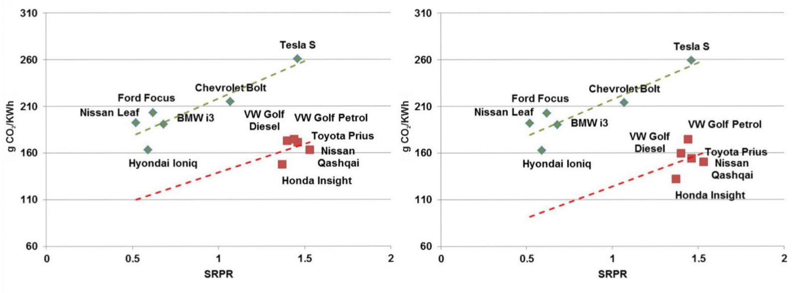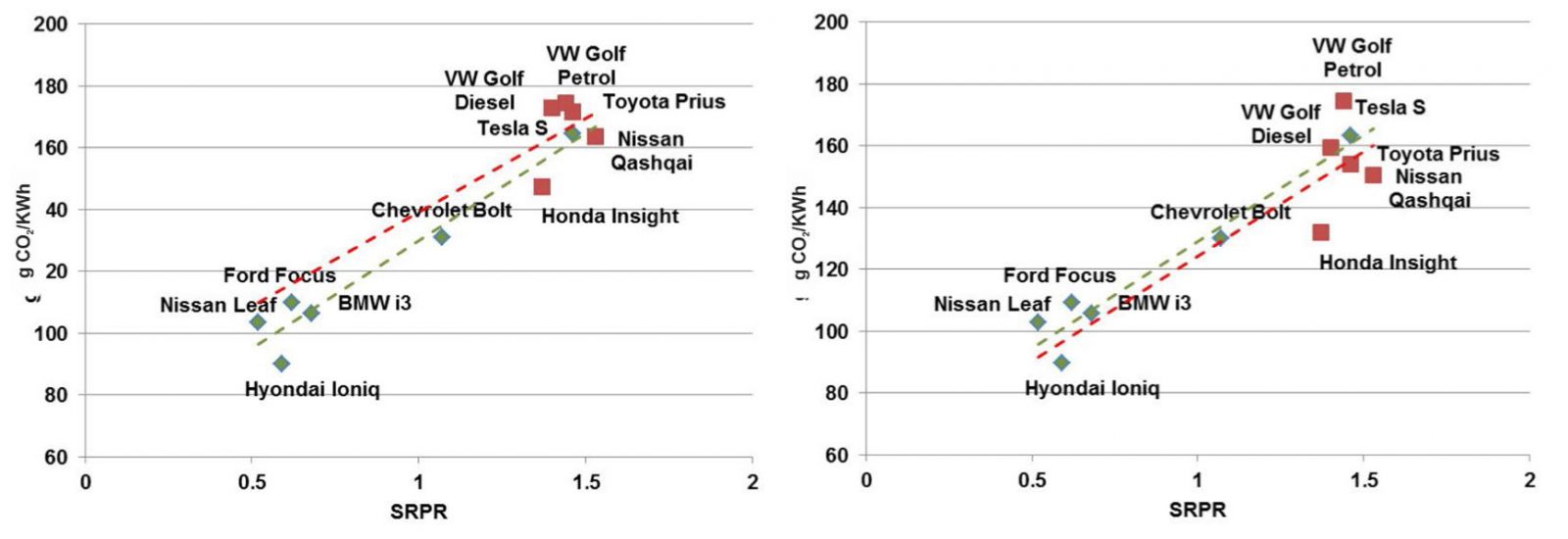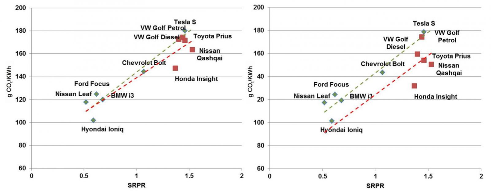 Figure 5. USA: Greenhouse Gas Emissions over the Life Cycle of Vehicles with a Mileage of 150 Thousand km (Left) and 200 Thousand km (Right), g CO2/km