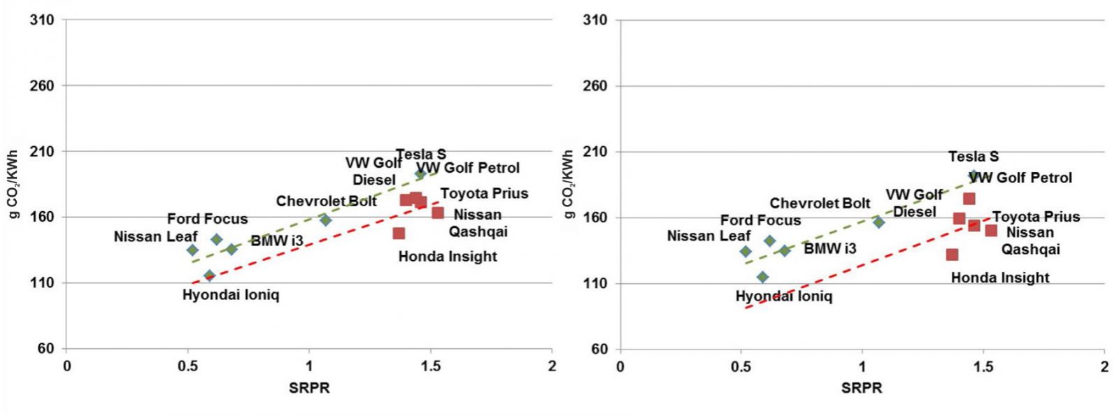 The assessment of the integral SRPR indicator shows that electric vehicles are inferior in technical characteristics to ICEV, with the exception of Tesla (Table 1, Figs. 4–7). Therefore, the comparison will be performed in four cases: a comparison of GHG emissions of electric vehicles and ICEV with a mileage of 150 thousand km and 200 thousand km directly and with a mileage of 150 thousand km and 200 thousand km taking into account technical characteristics (according to the trend indicator).